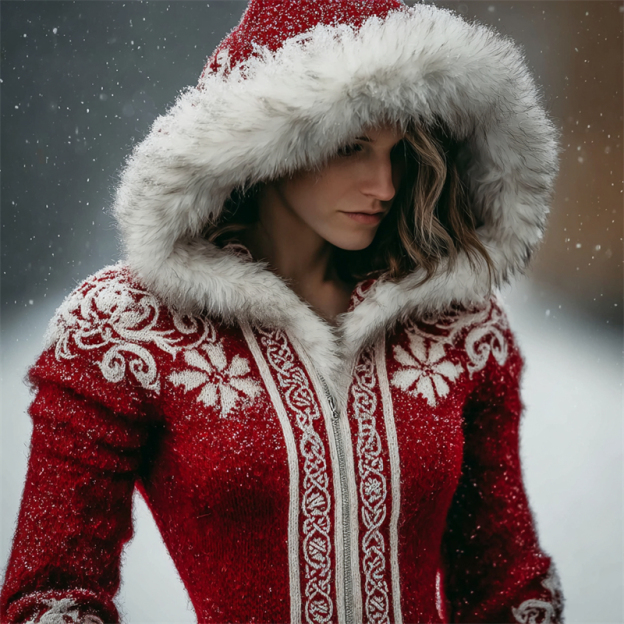 Christmas Snowflakes Celtic Fur Trim Hooded Cardigan