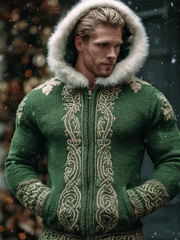 Men's Christmas Viking Elf Celtic Fur Hooded Cardigan