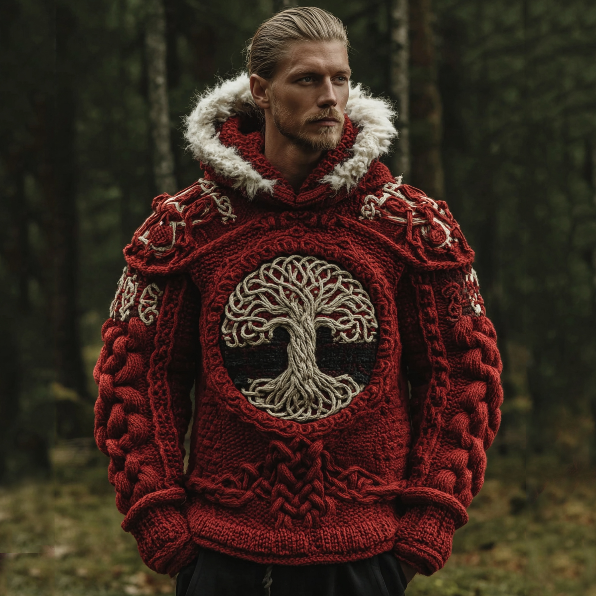 Men's Vintage Viking Tree Of Life Jacquard Knit Hooded Sweater