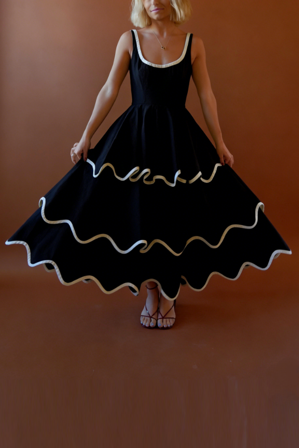 Featuring a three-tiered skirt with a circular cut, the dress boasts a full and voluminous silhouette that flows beautifully when twirling. The multi-layered, voluminous skirt creates an airy feel when moving, preserving the elegance of vintage dresses while adding a touch of sexiness with its open-back design. Each layer of the skirt is finished with a dark green trim, showcasing exquisite handcrafted details and elevating it beyond the ordinary long dress. The fabric drapes well and is wrinkle-resistant, ensuring both comfort for everyday wear and a sophisticated look for going out. The fitted bodice is lined, and the drawstring round neckline is adjustable for a comfortable and secure fit. Exquisite contrasting stitching highlights the delicate details of the princess-seam bodice, while invisible side pockets and a hidden zipper combine simplicity with practicality.
