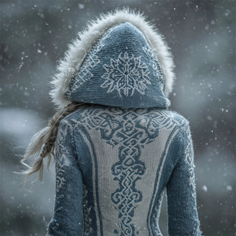 Vintage Snowflake Viking Celtic Knot Fur Trim Hooded Sweater
