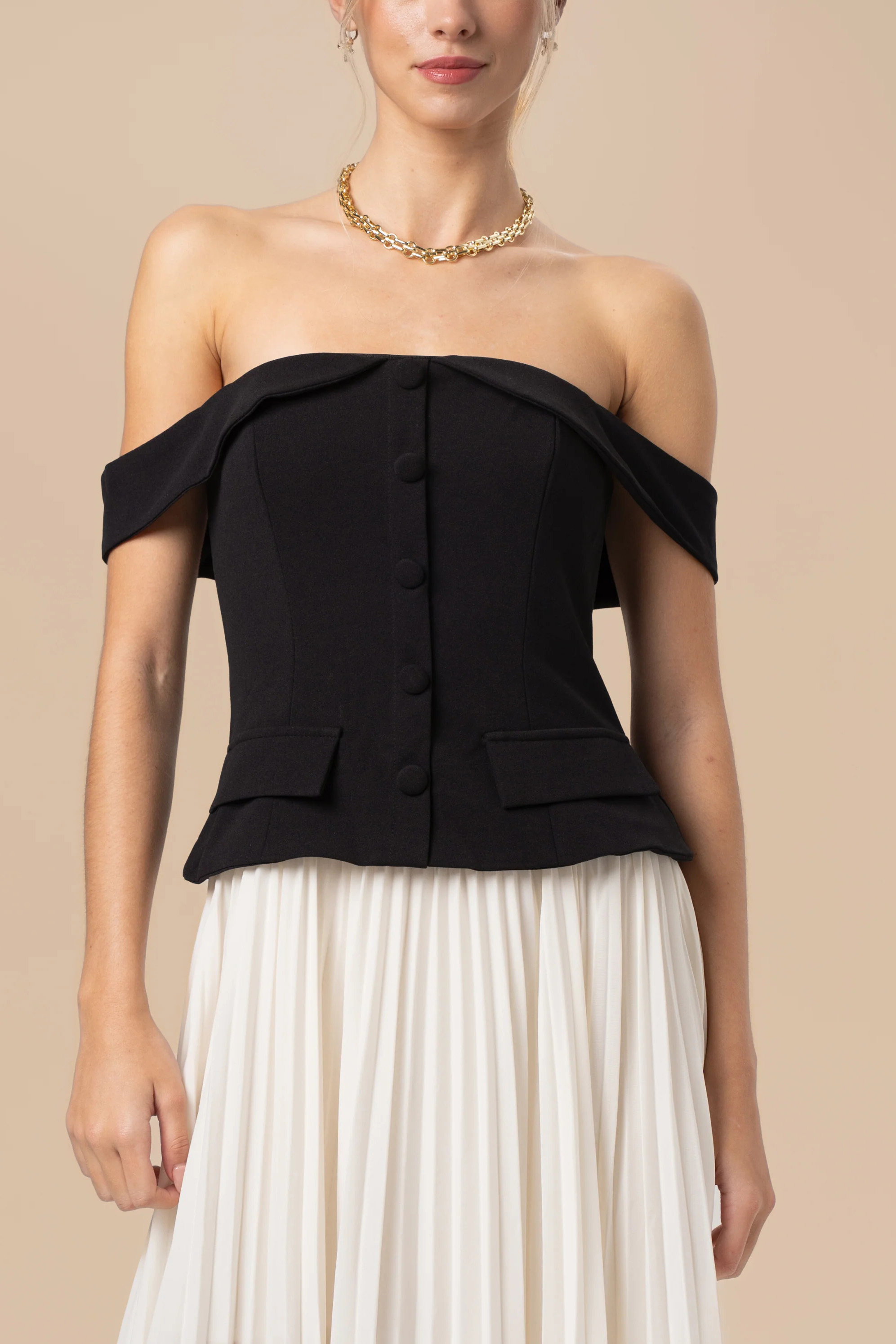 Elegant and architectural, the Vivienne Dress is made for modern occasions that call for timeless charm. The off-shoulder black bodice features a structured fit with tonal button detailing and subtle flap accents for a tailored finish. It cinches at the waist before flowing into a crisp ivory pleated skirt that moves gracefully with every step. A concealed zipper closure at the back ensures a seamless silhouette. Sophisticated yet unexpected, Vivienne is your answer to elevated dressing with edge.