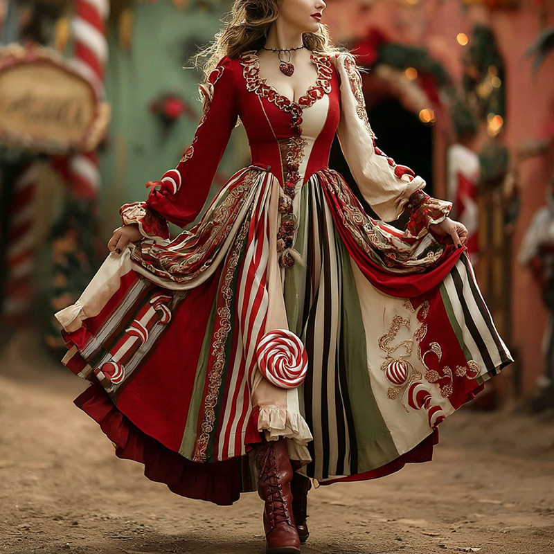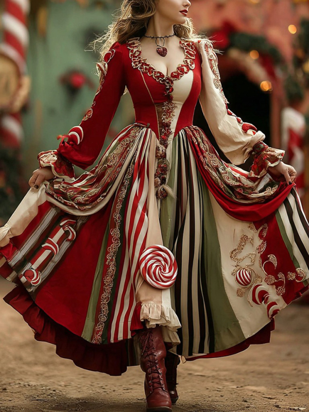 Women's Christmas Candy Stripe Casual V-neck Maxi Dress