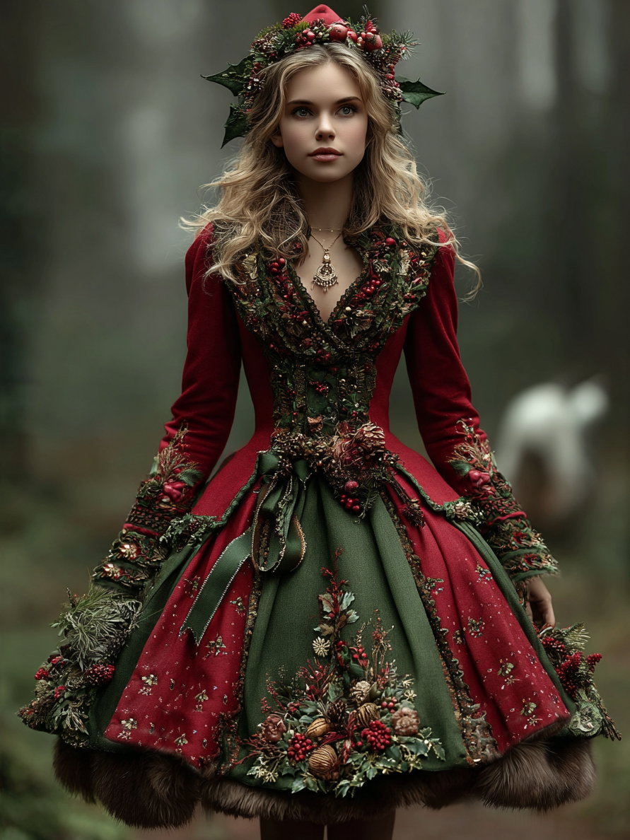 Women's Christmas Holly Leaves And Berries Patchwork Midi Dress